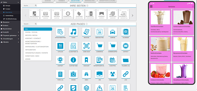 Mit unserem Appbuilder sind Sie in der Lage, nahezu alle Vorhaben umzusetzen, die Sie sich für Ihre professionelle App wünschen. Sie sind in der Lager einen Realtime Chat, einen Kleinanzeiger, ein Ticketsystem (Ticketverkauf) oder auch ein Buchungssystem für Reservierungen etc. zu integrieren. Aber das ist noch längst nicht alles. Sehen Sie sich Ihre Möglichkeiten hier an